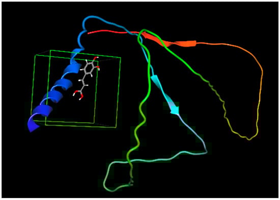 In order to interpret the entrapment efficiency of caffeic acid on casein nanoparticles, molecular docking experiments were performed. The crystal structure of casein (κ-casein) was obtained from the EMBL-EBI AlphaFold protein Structure Database (https://alphafold.ebi.ac.uk/entry/Q5ZGI1 accessed on 30 May 2024). The structure of the k-casein chain was encoded as UniProt Q5ZGI1. The IUPAC name corresponding to the chemical structure of the investigated molecule, caffeic acid, was obtained through PubChem®. The 3D configuration of the molecule was generated using the ChemDraw Ultra version 10 (Cambridgesoft, Waltham, MA, USA). Additionally, the energy minimization was attained using the MM2 forcefield of the same program []. The docking experiment was accomplished using ArgusLab v.4.50 (Mark Thompson and Planaria Software LLC, Seattle, WA, USA). The sybyl2 file of casein was imported to ArgusLab where the identification of the binding sites was performed [] to be ready for docking using the ASscore of the program []. The binding site box size was 15 × 15 × 15 angstroms. Additionally, the Dock and Flexible calculations were used at the maximum number of 150 poses.