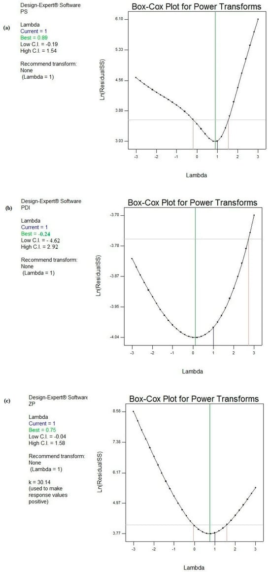 Consequently, Box–Cox plots did not suggest any recommendations for the responses PS, PDI, and ZP. In other words, the current powers (lambda) were found to precisely coincide with the best lambdas and were located between the low and high confidence intervals for the pre-mentioned models [,,].