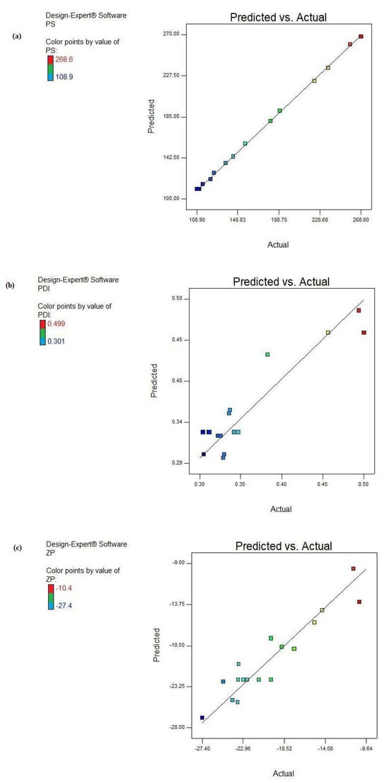 Predicted versus actual result plots of the responses: (a) PS, (b) PDI, and (c) ZP.