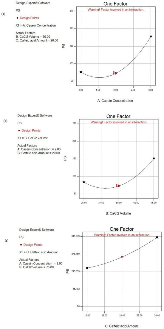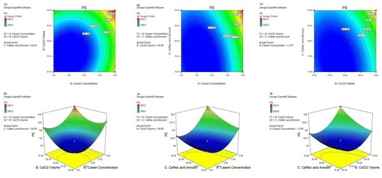 The three independent variables studied, CS concentration (A), CaCl2 volume (B), and CA amount (C), were found to be highly significant terms (p < 0.0001) affecting the PS response, as depicted from the ANOVA results in Table 4. Moreover, all the possible 2-FI interactions are highly significant terms scoring p < 0.0001, as observed in Table 4.