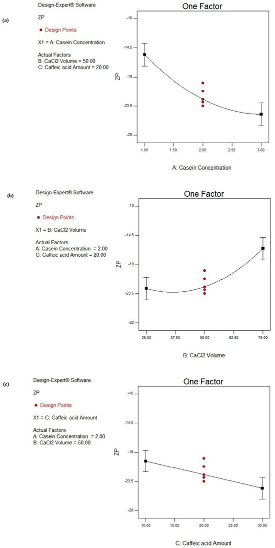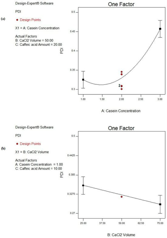 Based on the ANOVA results shown in Table 4, the CS concentration (A) is a highly significant factor (p ˂ 0.0001) affecting the PDI response. Moreover, the CaCl2 volume (B) reveals a significant effect on the PDI response (p ˂ 0.05), while the CA amount (C) is a non-significant parameter (p > 0.05), as depicted in Table 4 and Figure 6. Moreover, no significant interactions between the studied factors are deduced from the design, as observed in Table 4.