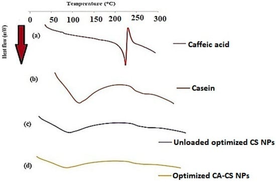 The thermal properties of CA, CS, unloaded CS NPs, and the optimized CA-loaded CS NPs were investigated using DSC (Shimadzu DC-60, Kyoto, Japan). Samples were sealed in aluminum pans with lids and heated at a rate of 10 °C/min. to a temperature of 300 °C, using dry nitrogen as the carrier gas with a flow rate of 25 mL/min. Indium was used as the standard reference material to calibrate the energy and the scale temperature of the instrument.