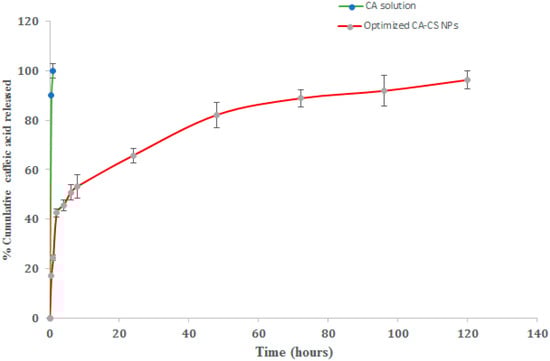 CA is highly encapsulated within the matrix of CS NPs exhibiting an EE% range from 93.52 ± 4.98 to 97.26 ± 1.98%, as depicted in Table 2. This could be from the high binding affinity between the CS protein and the drug [] ascribed to the electrostatic interaction between these two entities that enhanced the CA entrapment within the CS matrix, thus lowering the presence of free molecules [].