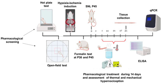 In this study, the initial phase involved a pharmacological screening using both mice and rats. Mice were evaluated using the hot plate test, while rats were subjected to locomotor assessments. For randomization, the animals were divided into two groups: one receiving the vehicle (DMSO) and the other treated with a CBG-rich cannabis extract. From this point, only rats were utilized in the subsequent experiments. The next phase involved inducing a perinatal hypoxic-ischemic (HI) model, where offspring were tested with the formalin assay on postnatal days 30 (P30) and 45 (P45). Animals were administered DMSO, CBG, or ASA via oral (using a gavage). In the following stage, a distinct group of P45 HI and sham rats underwent spinal nerve ligation surgery (SNL) to induce a chronic pain model. Nociceptive responses were monitored for 14 days, with animals receiving CBG or DMSO orally by gavage throughout this period. Finally, molecular analyses were conducted on spinal cord tissues collected post-experimentation. The full timeline of experimental procedures is illustrated in Figure 1.