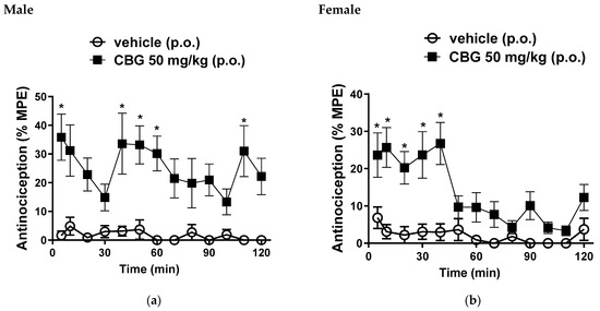 In male mice, we observed a mean %MPE of 35.8 ± 8%; 33.6 ± 10.6%; 33.1 ± 6.6%; 30.1 ± 6.6% and 31 ± 8.8% at 5, 40, 50, 60 and 110 min, respectively, following oral administration of CBG at a dose of 50 mg/kg (Figure 2a). Female mice exhibited %MPE values of 23.2 ± 5.9%; 25.6 ± 5.3%; 20.2 ± 4.3%; 23.6 ± 6% and 26.7 ± 5.6% at 5, 10, 20, 30 and 40 min, respectively, with the same 50 mg/kg oral dose of CBG (Figure 2b). These results are significant when compared to the vehicle control group, confirming the central antinociceptive activity of this CBG dose.