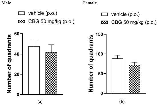 In the open-field test, a single oral administration of 50 mg/kg of CBG or a vehicle was given. Figure 3 shows the number of quadrants crossed by the animals 35 min after administration. The number of quadrants crossed by the animals in the open field was observed for 5 min and showed no significant differences between the CBG-treated group and the vehicle-treated group for both male and female rats.