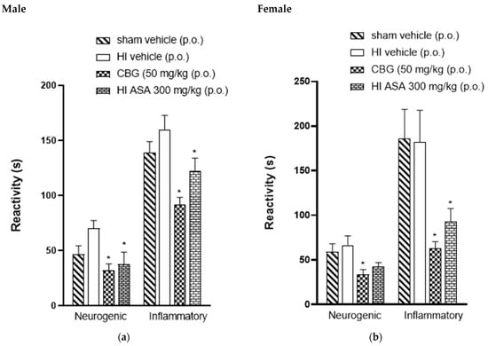 The acute peripheral antinociceptive effect was investigated using the formalin test. Figure 4 presents the neurogenic and inflammatory phase responses following formalin injection in HI (P30) animals treated orally with vehicle, acetylsalicylic acid (ASA 300 mg/kg), and CBG (50 mg/kg), as well as sham-operated HI animals. It was observed that the formalin response time during the neurogenic phase in the CBG-treated group was significantly reduced to 31.6 ± 3.7 s and 35.3 ± 1.4 s for male and female rats, respectively, compared to 41.2 ± 4.3 s and 52.7 ± 6.0 s in the vehicle group for male and female rats, respectively. Therefore, during the inflammatory phase of the formalin test, HI animals treated with CBG at a dose of 50 mg/kg showed a decrease in formalin response time from 125.3 ± 18.9 s and 147 ± 18.5 s (vehicle) to 97.8 ± 18.2 s and 76.8 ± 6.6 s for male and female rats, respectively, as shown in Figure 4.