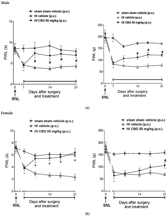 Figure 6a,b show that SNL significantly reduced the paw withdrawal latency in response to thermal stimuli 7 days after surgery, indicating thermal and mechanical hypernociception. There was no hypernociception in the sham group (HI and SNL surgery). The paw withdrawal latency (PWL) of SNL rats decreased from 6.3 ± 1.2 s and 5.1 ± 0.9 s; 121.8 ± 16.1 g and 124.5 ± 2 g (baseline of the day 0) to 3.4 ± 0.2 s and 2.8 ± 0.4 s; 41.42 ± 3.3 g and 30.8 ± 1.9 g (day 7) in thermal and mechanical hypernociception for male and female rats, respectively. Treatment with CBG (50 mg/kg) increased the latency (p < 0.05) to 7.3 ± 0.5 and 5.2 ± 0.7 s; 78.4 ± 6.6 and 81.6 ± 7.2 g in the evaluation of thermal and mechanical hypernociception for male and female rats, respectively. The reversal effect of thermal and mechanical hypernociception was observed after the 10th and 17th days post-surgery, respectively.