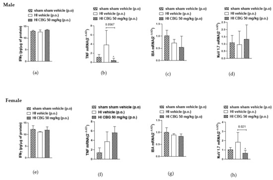Inflammatory cytokines, the direct mediators of local inflammation, play a crucial role in the transmission of motor and sensory information in the spinal cord [38]. It is known that pro-inflammatory cytokines such as IFN-gamma and TNFα and Nav1.7 are significantly upregulated during chronic pain [39,40,41,42]. In this study, we aimed to evaluate the levels of both cytokines in the spinal cord between the L1 and L5 segments of rats in different experimental groups. No difference was detected in the protein levels of IFN-gamma in the spinal cords of both experimental groups. We observed an increase in TNFα mRNA levels in the HI vehicle group of male rats, with a reduction noted in the CBG-treated group. However, no reduction in TNFα levels was observed in female rats following treatment. Additionally, a decrease in Nav1.7 mRNA levels was observed in the spinal cord of females in the CBG-treated group, whereas no decrease was observed in males treated compared to the vehicle group. No differences were observed in IBA levels between males and females, nor between animals treated with vehicle or CBG (Figure 7).