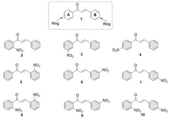 - Hidalgo, A.Y.; Velasco, M.; Sánchez-Lara, E.; Gómez-Rivera, A.; Vilchis-Reyes, M.A.; Alvarado, C.; Herrera-Ruiz, M.; López-Rodríguez, R.; Romero-Ceronio, N.; Lobato-García, C.E. Synthesis, Crystal Structures, and Molecular Properties of Three Nitro-Substituted Chalcones. Crystals 2021, 11, 1589. [Google Scholar] [CrossRef]