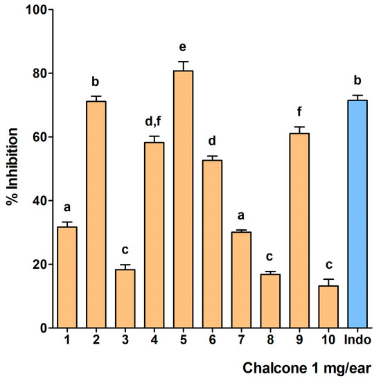 Comparison of the inhibitory effects of chalcones 1–10 on inflammation in the TPA-induced mouse ear edema model. The data are reported as the mean ± standard error (n = 5 for each treatment). The statistical significance of the observed differences was determined by analysis of variance (ANOVA) followed by Tukey’s test. Bars with the same letter (a–f) indicate that the groups do not differ significantly at p ≤ 0.05.