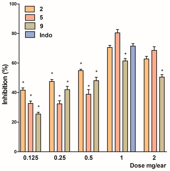 Anti-inflammatory effects of compounds 2, 5 and 9 at different doses and Indo at a single dose. The values are reported as the means ± standard errors (n = 5 for each treatment). Statistical differences were determined by analysis of variance (ANOVA), followed by Dunnet’s test. * p ≤ 0.05 vs. Indo.