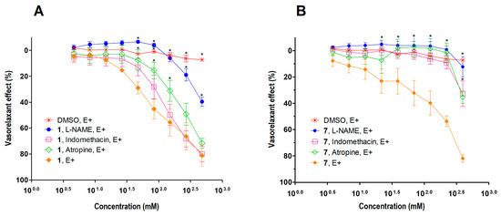 Vasorelaxant effects of compounds 1 (A) and 7 (B) in the presence of L-NAME, Indo, and atropine on NA (0.1 µM)-induced contraction in aortic rings with endothelium. The data are presented as the means ± standard errors (n = 5 for each treatment). The statistical significance was determined by analysis of variance (ANOVA), followed by Tukey’s test. A value of * p ≤ 0.05 was considered statistically significant.
