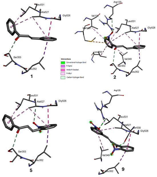 The molecular docking results of compounds 1, 2, 5, and 9 with COX-1 demonstrated an affinity energy range of −8.0–−7.5 kcal/mol, and the following interactions were observed: the carbonyls of compounds 1, 2, and 5 formed carbon hydrogen–hydrogen bonds with Ser353, whereas the carbonyl group of compound 9 similarly interacted with Ser530. The benzene ring A of compounds 1, 2, and 5 interacted with Leu531 via a π–alkyl interaction, whereas ring B of these same compounds exhibited π–sigma interactions with Leu352 and stacked amide–π-type interactions with Gly526. Similarly, Ala527 interacted with the A and B rings of compounds 1, 2, and 5 via π–alkyl bonds. The presence of the nitro group in the ortho position of the A-ring of compound 2 resulted in the interaction of one of the oxygens of the nitro group with Arg120 through conventional hydrogen bonding. Additionally, this ring exhibited further π–alkyl interactions with the amino acids Val349, Leu359, and Val116, and π–sulfide interactions with Met113. In the ortho position of ring B of compound 5, the nitro group engaged in a carbon–hydrogen bond with Ala527. Compound 9, which is substituted with a nitro group at both the ortho position of ring A and the meta position of ring B, demonstrated interactions between ring A and Leu352 of the π–sigma type, and with Gly526 of the stacked amide–π type. In ring B, the π–sigma interactions were with Leu531 and Val349, whereas with Ala527, they were of the π–alkyl type. For the nitro groups, only the one in ring B interacted with amino acid Arg120 via conventional hydrogen bonding (Figure 5).