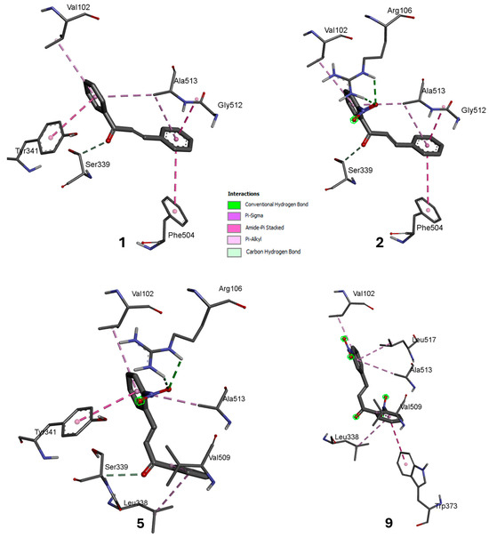 Molecular docking studies of compounds 1, 2, 5, and 9 with the COX-2 enzyme revealed affinity energies ranging from −9.3 to −8.2 kcal/mol, indicating compound-specific interactions. All the compounds except 9 exhibited carbonyl group interactions with Ser339 via carbon–hydrogen bonding. In ring A, compounds 1 and 2 formed π–alkyl bonds with Val102, whereas compounds 5 and 9 exhibited similar interactions with Val509. The A and B rings of compounds 1 and 2 interacted with Ala513 via π–alkyl bonds, whereas in compounds 5 and 9, only ring B had similar interactions with Ala513. Compound 1 exhibited additional interactions, including a π–π T-shaped interaction between ring A and Tyr341, a stacked amide–π interaction between ring B and the amino acid Gly512, and a π–π-stack interaction between ring B and Phe504. In the case of compound 2, ring A did not exhibit any additional interactions. However, the nitro group present in the ortho position of this same ring engaged in conventional hydrogen bonding with Arg106, whereas ring B demonstrated interactions with Gly512 and Phe504 through stacked amide–π interactions. In the case of compound 5, ring A also interacted with Leu338 via a π–alkyl bond, whereas ring B, which contains a nitro group in the ortho position, interacted with Tyr341 via a π–π T-shaped interaction. Additionally, one of the oxygens of the nitro group interacted with Arg106 via a conventional hydrogen bond.