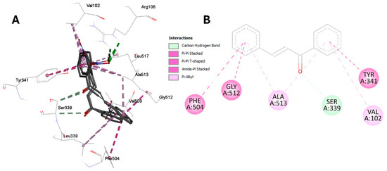 The docking of the chalcone and nitrochalcones at the COX-2 binding site with CEL enabled identifying a generic binding mode for the chalcone rings A and B (Figure 8A). The residues responsible for stabilizing the rings were primarily Ala513, which interacted with both rings of compounds 1, 2, 5, and 9. Val102, Tyr341, Phe504, and Gly512 were subsequently identified as contributing to stabilizing the chalcone core (Figure 8B). All the compounds exhibited the same carbonyl orientation when bound to COX-2. However, for compounds 1 and 2, the rings could be reversed in position, although this did not affect the hydrogen bond interaction with Ser339.
