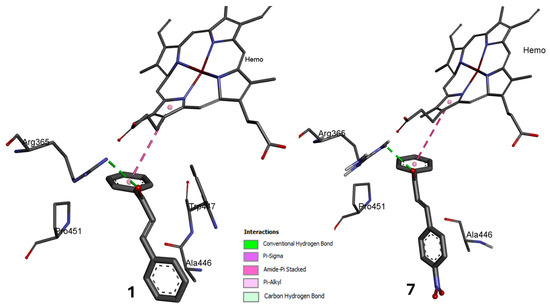 In the molecular docking study of compounds 1 and 7 with the eNOS enzyme, an affinity energy of −6.5 kcal/mol was obtained for both compounds. The experiments demonstrated that both compounds engage in hydrogen bonding with the amino acid Arg365 through their carbonyl groups. Ring A of both compounds interacted with the amino acid Pro451 via a π–alkyl bond and a Hem500 group. In the case of compound 1, the interaction occurred via a stacked π–π bond, whereas in the case of compound 7, it occurred via a π–sigma bond. While ring B exhibited an interaction only with Ala446, in compound 1, this interaction was conducted through a π–sigma bond, and in compound 7, it occurred through a π–alkyl bond. Concerning compound 7, which contains a nitro group in the B-ring, no interaction of the nitro group with any amino acid was observed. The primary distinction between these compounds is evident in compound 1, which has an additional interaction of the double bond with the amino acid Trp447 (Figure 9).