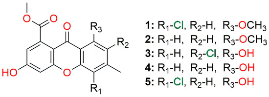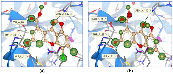 A docking study on the main protease SARS-CoV-2 (PDB ID: 7ZQV) revealed interesting insight into ligand–enzyme interactions. All of the five best marine origin compounds are of xanthene structures. The basis of these compounds is 2-hydroxy-4-acetoxy-7-methylxanthen-9-one, which comes in several variations, as 5-hydroxy or 5-methoxy, and with 6- or 8-chloro substituents (Figure 1, Figure 7 and Figure 8).