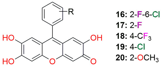 Contrary to the docking study of synthesized compounds with the main protease (Table 2), for the inhibition of papain-like protease, the best candidates are derivatives of 9-aryl-substituted 2,6,7-trihydroxyxanthen-3-one with the planar main xanthene core. Different only by the substituents on the aromatic ring at position 9 (Figure 5, Figure 13 and Figure 14), four out of the five best candidates are rich in halogen substituents, and only the fifth one is the methoxy derivative.