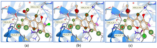 Binding modes and contacting amino acid residues of the synthesized compounds 8 (a), 9 (b), and 10 (c) within the main protease active site, with HYDE contributions of individual atoms to the total affinity (green circled atoms).