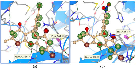 Binding mode and contacting amino acid residues of the synthesized compounds 6 (a) and 7 (b) within the main protease active site shown with HYDE contributions of individual atoms to the total affinity (green circled atoms).