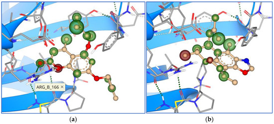 Figures represent HYDE contributions of individual atoms to the total affinity (green circled atoms). The higher the contribution of the atom to total affinity, the bigger the green circle. Figures also show red circled atoms as the opposite contribution to green atoms.