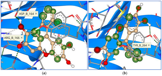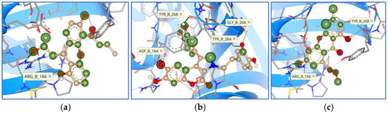 Calculated affinity values ranged from 0.171 to 0.286 mM (Table 4), indicating synthesized xanthene-3-one derivatives as overall best candidates against papain-like protease, confirming the previous conclusion that papain-like protease is an easily and more druggable target. Observed interactions were similar with marine compounds, mostly with amino acid residues Asp 164, Arg 166, and Tyr 264 (Figure 13 and Figure 14).