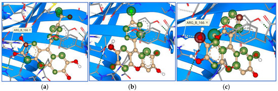 Binding modes and contacting amino acid residues of the marine compounds 13 (a), 14 (b), and 15 (c) within papain-like protease active site, with HYDE contributions of individual atoms to the total affinity (green circled atoms).
