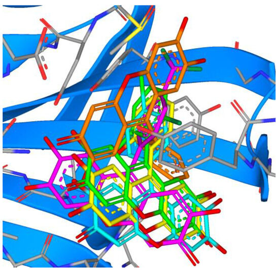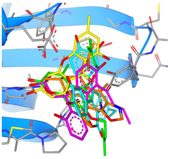 Overlay of the top five marine compounds within the active site of PLpro (11—green, 12—orange, 13—magenta, 14—cyan, 15—yellow).
