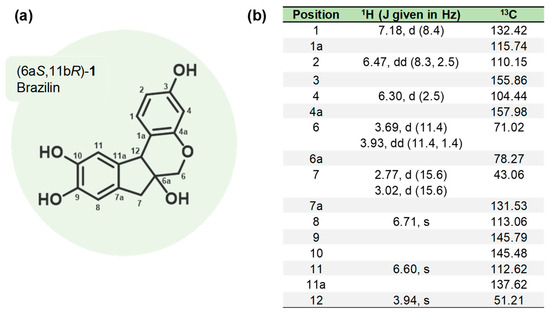 Brazilin isolated from H. brasiletto. (a) Chemical structure and (b) spectroscopic data (1H NMR and 13C NMR) of brazilin.