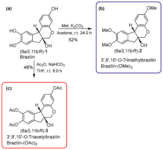 Semisynthetic route and with the experimental conditions used for the chemodiversification of (a) brazilin to (b) brazilin-(OMe)3 and (c) brazilin-(OAc)3.