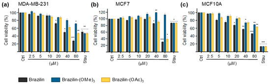 Cell viability of MDA-MB-231 (a), and MCF7 (b) breast cancer cells and MCF10A (c) cells after treatment with brazilin for 24 h. Differences from the control were determined with one-way ANOVA and Dunnett’s multiple comparison test. Statistical significance: * p < 0.05), ** p < 0.01), and *** p < 0.001). Staurosporine (Stau) was used as an in vitro positive control for apoptosis.