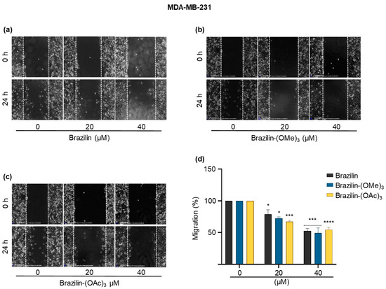 Wound closure assays of the effect of brazilin, brazilin-(OMe)3, and brazilin-(OAc)3 on cell migration of MDA-MB-231 cells. Cell cultures were exposed for 2 h with Ara-C to inhibit proliferation and treated with 20 µM and 40 µM of (a) brazilin, (b) brazilin-(OMe)3, and (c) brazilin-(OAc)3 for 24 h. Representative images of brightfield microscopy using 10x magnification; scale bars represent 400 μm. (d) Graphs represent the quantification of percent cell migration for each condition. The image is representative of three independent experiments. Differences with respect to control were determined by one-way ANOVA and Dunnett’s multiple comparison test. Statistical significance: * p < 0.05, *** p < 0.001, and **** p < 0.0001.