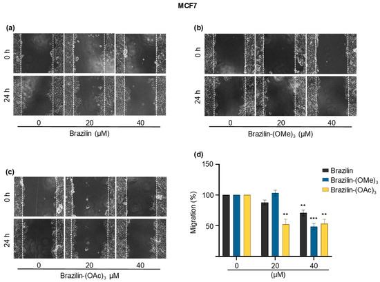 Wound closure assays of the effect of brazilin, brazilin-(OMe)3, and brazilin-(OAc)3 on cell migration of MCF7 cells. Cell cultures were exposed for 2 h with Ara-C to inhibit proliferation and treated with 20 µM and 40 µM of (a) brazilin, (b) brazilin-(OMe)3, and (c) brazilin-(OAc)3 for 24 h. Representative images of brightfield microscopy using 10x magnification; scale bars represent 400 μm. (d) Graphs represent the quantification of percent cell migration for each condition. The image is representative of three independent experiments. Differences with respect to control were determined by one-way ANOVA and Dunnett’s multiple comparison test. Statistical significance: ** p < 0.01); *** p < 0.001).