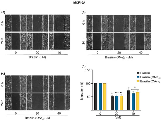Wound closure assays of the effect of brazilin, brazilin-(OMe)3, and brazilin-(OAc)3 on cell migration of MCF10A cells. Cell cultures were exposed for 2 h with Ara-C to inhibit proliferation and treated with 20 µM and 40 µM of (a) brazilin, (b) brazilin-(OMe)3, and (c) brazilin-(OAc)3 for 24 h. Representative images of brightfield microscopy using 10x magnification; scale bars represent 400 μm. (d) Graphs represent quantification of percent cell migration for each condition. The image is representative of three independent experiments. Differences with respect to control were determined by one-way ANOVA and Dunnett’s multiple comparison test. Statistical significance: ** p < 0.01; *** p < 0.001.