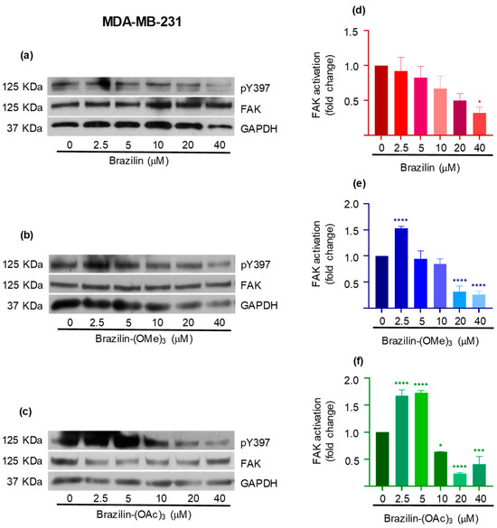 Effect of brazilin, brazilin-(OMe)3, and brazilin-(OAc)3 on FAK activation in MCF7 cells. Cell cultures were treated with the different compounds (2.5–40 μM) for 24 h. Western blot of FAK activation corresponding to treatments with (a) brazilin, (b) brazilin-(OMe)3, and (c) brazilin-(OAc)3 in MDA-MB-231 cells. (d–f) Graphs corresponding to the densitometric and statistical analysis of the bands obtained by WB. Statistical analysis was performed by one-way ANOVA and Dunnett’s multiple comparison test. Statistical significance: * p < 0.05, ** p < 0,01, *** p < 0.001, and **** p < 0.0001.