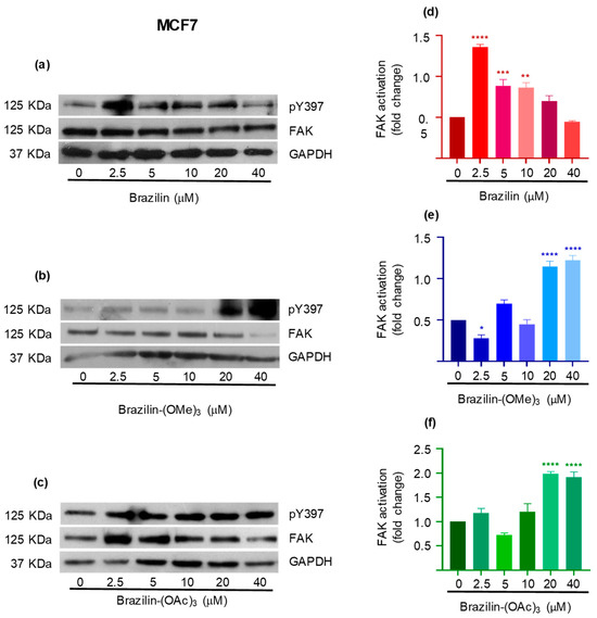 To determine the effect of brazilin, brazilin-(OMe)3, and brazilin-(OAc)3 on FAK activation, we performed Western blotting of the total proteins obtained from the MDA-MB-231, MCF7, and MCF10A cells treated with 2.5, 5, 10, 20, and 40 µM of the different compounds for 24 h.