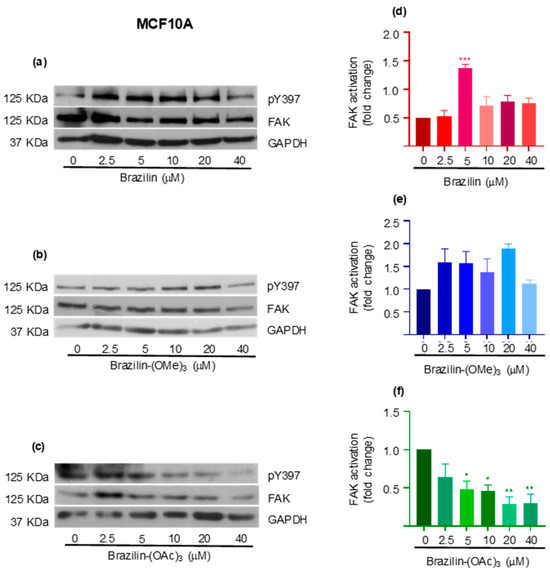 The results corresponding to the MCF10A cells show that brazilin and brazilin-(OMe)3 promote FAK activation with respect to the control (Figure 10a,b). Conversely, brazilin-(OAc)3 decreases FAK activation in a concentration-dependent manner (Figure 10d).