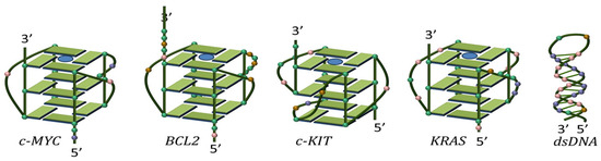 Targeting secondary DNA structures represents a novel anticancer drug design and development approach. Diverse families of compounds that bind and/or stabilize G-quadruplex DNA over their duplex counterparts have been identified [20,21]. Most of these molecules contain extended aromatic structures with planar and electron-deficient ring systems for π-π stacking with a G-quartet platform instead of intercalating among the stacked base pairs of the DNA, as known for many duplex DNA-binding ligands (Figure 2) [22,23]. Additional side chains, appended to the molecular scaffolds, can participate in favorable electrostatic interactions among the loops and grooves of the quadruplex DNA, improving and enhancing double-stranded DNA-binding specificity and affinity [4,24]. Two criteria (i.e., electrostatics as well as π-stacking) have so far served as a guide for the logical design of G-quadruplex-interacting molecules (Figure 3) [25,26,27,28,29]. Several of these substances, such as anthraquinones, acridines, perylenes, and porphyrins, have polyaromatic heterocyclic ring structures [30,31,32,33,34,35,36].