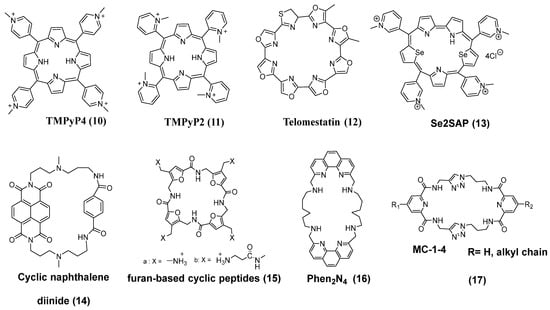 In a recent study, Dash and coworkers used c-MYC and h-TELO G-quadruplexes as templates to develop a new class of peptidomimetic macrocycle 17 ligands by utilizing bifunctional building blocks of alkyne and azides [56,57].