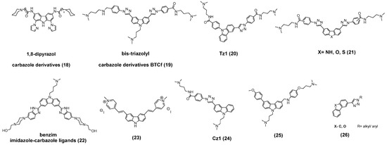 In subsequent research, the selectivity of a range of carbazole derivatives for G-quadruplexes was designed and assessed via a FRET melting assay [73,74,75]. The most promising were compounds 25 and 26, which displayed a lower melting point for double-stranded DNA and a comparatively high ΔTm value for G-quadruplex DNA (23.4 °C).