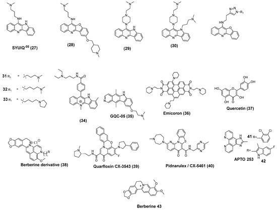 Fluoroquinolones are a different group of compounds that have the ability to target DNA. Two fluoroquinolone derivatives, quarfloxin (CX-3543) 39 and pidnarulex (CX-5461) 40, have been created to selectively target G-quadruplex nucleic acids. For distinct G-quadruplexes, they result in ΔTm > 15 °C in a FRET melting experiment. To cure cancer, they began conducting clinical studies on people. Compound 39 advanced to a phase II clinical trial (NCT00780663) for treating neuroendocrine cancer, but the trial was terminated because of subpar clinical results [42,92,93].