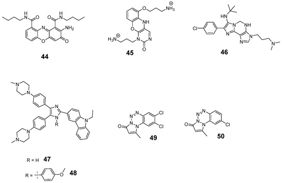 Tricyclic compounds, like phenoxazine 44, are components of well-known antibiotic and antitumor drugs (Figure 7). In the Ramos cell line compared to the CA46 cell line, where the NHEIII1 G-quadruplex-forming region in the promoter no longer regulates c-MYC transcription, this compound showed antiproliferative action and a larger inhibitory impact (by 25–40%) on c-MYC transcription. [102,103]. Additionally, compared to BCl2, VEGF, and HIF-1a promoters, 44 also showed increased c-MYC promoter amplification inhibitory efficacy using Taq polymerase [104]. In another study, two additional phenoxazines with distinct side chains were examined with an emphasis on lead 45. In contrast to the lead compound (ΔTm = 18 °C), however, in a FRET melting test, these novel compounds did not result in larger fluctuations in the G-quadruplex Tm (ΔTm = 0 and 9 °C, respectively) [105].