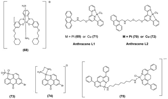 Furthermore, in a FRET melting test, it was shown that dinuclear platinum complexes, such as 75, with a ΔTm of 8.5 °C, could stabilize G-quadruplex structures as well as bind to c-MYC G-quadruplexes more preferentially than duplex DNA. Through p-stacking and cross-linking with purines in G-quadruplexes via their alkyl chains, these complexes interacted with G-tetrads [134]. Recently, Dash and coworkers developed different strategies for stabilizing the G-quadruplexes for cancer treatment using copper-catalyzed click chemistry, and novel technologies are coming for cancer treatment [135,136,137,138,139,140].