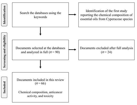 Initially, 90 scientific articles were identified in the consulted databases (Figure 1). After applying the inclusion and exclusion criteria, 24 documents were eliminated. Thus, 66 articles that provided data on the chemical composition, anticancer potential, and toxicity of EOs from Cyperaceae species were included in this review. The results were organized into three main categories: (1) chemical composition of essential oils from Cyperaceae species; (2) anticancer activity of essential oils from Cyperaceae species; and (3) acute oral toxicity of essential oils from Cyperaceae species.