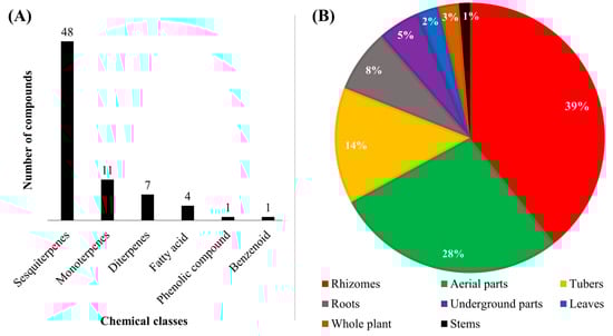 Representative classes of essential oils (A) and plant parts used (B) in the extraction of EOs from Cyperaceae.