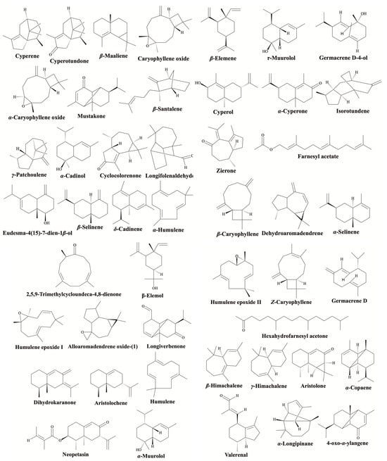 As previously reported, sesquiterpenes represent the majority of compounds identified in EOs of Cyperaceae species, with an emphasis on cyperene, cyperotundone, caryophyllene oxide, mustakone, and α-humulene (Figure 4). Cyperene has been widely identified by GC-MS in EOs from several species, including Carex pseudofoetida Kük. [], Cyperus difformis L. [,], Cyperus arenarius Retz. [], Cyperus articulatus L. [], Cyperus esculentus L. [], Cyperus capitatus Vand. [], Cyperus compressus L. [], Cyperus conglomeratus Rottb. [], Cyperus distans L.f. [], Cyperus giganteus Vahl [], Cyperus papyrus L. [], Cyperus rotundus L. [,], and Eleocharis uniglumis (Link) Schult. []. Furthermore, cyperotundone has also been identified as one of the predominant compounds in several Cyperaceae species [,,,].