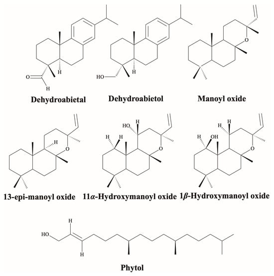 Seven compounds belonging to the diterpene class (Figure 6) were identified in the EOs of Kyllinga brevifolia Rottb. (Cyperus brevifolius (Rottb.) Hassk.) [,], Kyllinga erecta Schumach. (Cyperus erectus (Schumach.) Mattf. & Kük.) [], Cyperus laevigatus L. [], and Fimbristylis falcata (Vahl) Kunth []. Manoyl oxide was the main compound present in the EOs of C. brevifolius [] and K. erecta []. According to Gani et al. [], manoyl oxide showed anticancer potential in vitro and exhibited an IC50 of 50 µM against the MCF-7 cell line.