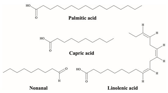 Compounds such as capric acid, nonanal, palmitic acid, and linolenic acid (Figure 7) were identified in the EOs of Carex meyeriana Kunth [], Scleria hirtella Sw. [], and Scleria striatonux De Wild. []. The anticancer activity of fatty acids has been widely reported in the literature [,,,]. Zhu et al. [] reported that after 48 h of treatment, palmitic acid (0.1–50 μM) inhibited the growth of PC-3 and DU145 cell lines in a dose-dependent manner, exhibiting IC50 values of 10.72 and 16.83 μM, respectively. According to Wang et al. [], the main anticancer mechanism of palmitic acid involves the induction of cellular apoptosis via the mitochondrial pathway and interference with the cancer cell cycle, predominantly resulting in cell cycle arrest in the G1 phase.