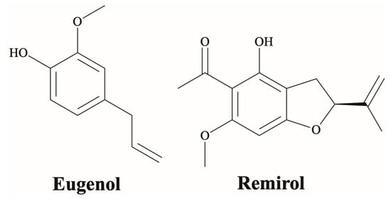 The phenolic compound eugenol was identified in the EO of the rhizomes of Cyperus conglomeratus Rottb. [], while the benzenoid remirol stood out as the major compound of the EO of Remirea maritima Aubl. (Cyperus pedunculatus (R.Br.) J.Kern) [] (Figure 8). Several studies have already reported the anticancer properties of eugenol [,,]. This potential is mainly attributed to its antimetastatic, antiproliferative, antiangiogenic, anti-inflammatory, cell cycle arrest induction, apoptotic, and autophagic effects []. According to Padhy et al. [], eugenol acts on multiple signaling pathways to exert its anticancer effects, the major ones being the MAPK/ERK, JNK/STAT3, WnT/β-Catenin pathway, E2F1/survivin, and NF-κB signaling cascades.